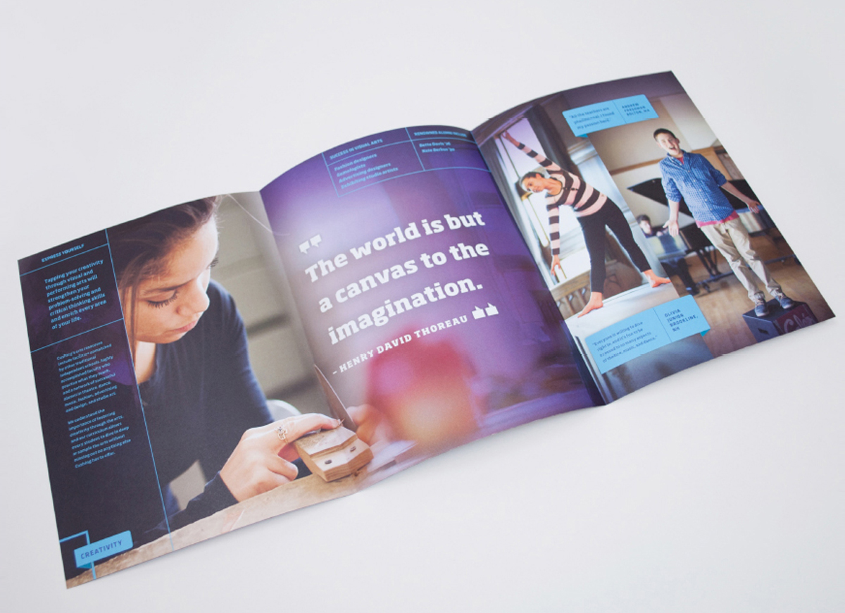 Cushing Academy is an independent boarding school established in 1865 and known for strong programs in academics, athletics, and arts. The rebrand consisted of a new logo based on an iconic building on campus, and recruitment materials to express Cushing’s holistic approach to education. The viewbooks feature a set of icons representing different areas of interest for prospective students, and can be arranged in a customizable packet to speak to the interests of individual students. Brand guidelines also included a visual standards for atheltics branding, signage, and apparel design.
