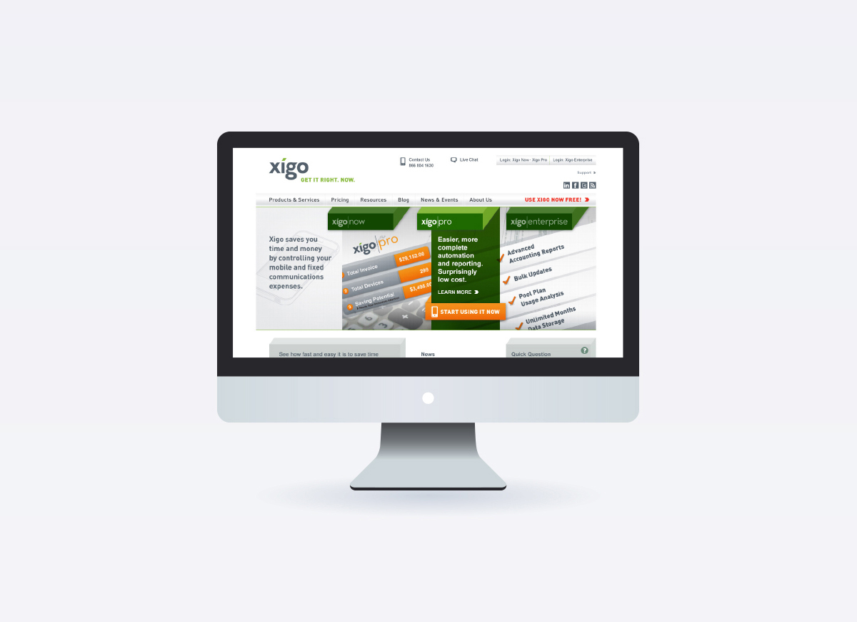Rebranding for Xigo, a communications management platform. Full rebrand included design of an identity, website, stationery and print materials, trade show graphics, and brand guidelines, all focused on showing momentum and movement while clarifying a complex suite of offerings.